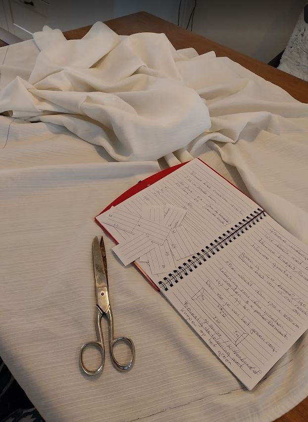 De lap stof voor het project sprei ligt klaar. De berekeningen zijn gemaakt en notities moeten me helpen om alles op de rit te houden. Hoe moet de afmeting van de lap zijn, op welke stand moet de naaimachine staan…