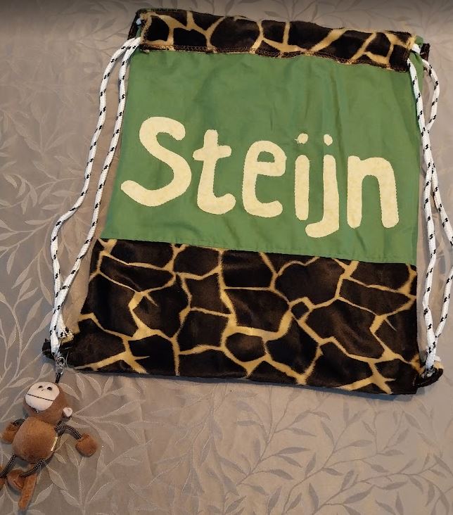 We overlegden samen wat er op de tas moest staan, een dier, een naam… Het werd zijn naam. Hij koos voor de gele stof, ook een lievelingskleur. Toen hij de volgende dag weer naar huis ging heb ik de tas afgemaakt en gingen wij een paar dagen op citytrip. Morgen wordt de verjaardag gevierd, het eerste cadeau is klaar.