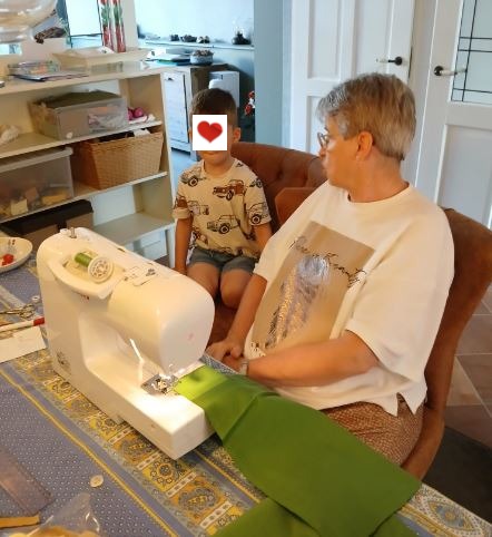 Zo’n naaimachine was ook een ontdekking en om er voor te zorgen dat hij straks niet zijn vingers onder de naald kon krijgen moest ik hem leren dat dat pijnlijk zou zijn. Ik tekende zijn vingers op een papiertje. Plaatste daar wat nageltjes in en liet zien dat een naald dwars door vingers kon gaan door het papiertje onder het naaivoetje te leggen. Aarzelend hielp hij toen mee de stof onder de naald door te bewegen. Voorzichtigheid zat er nu goed in.