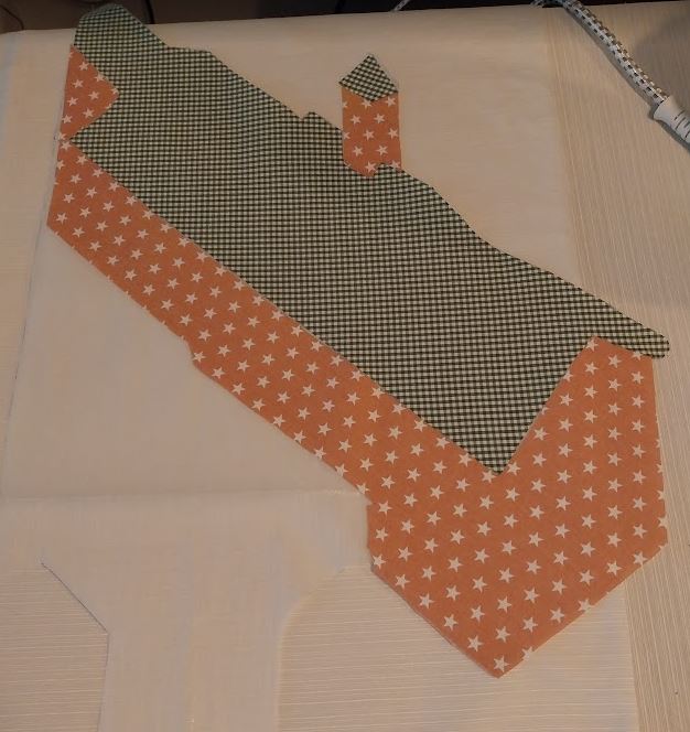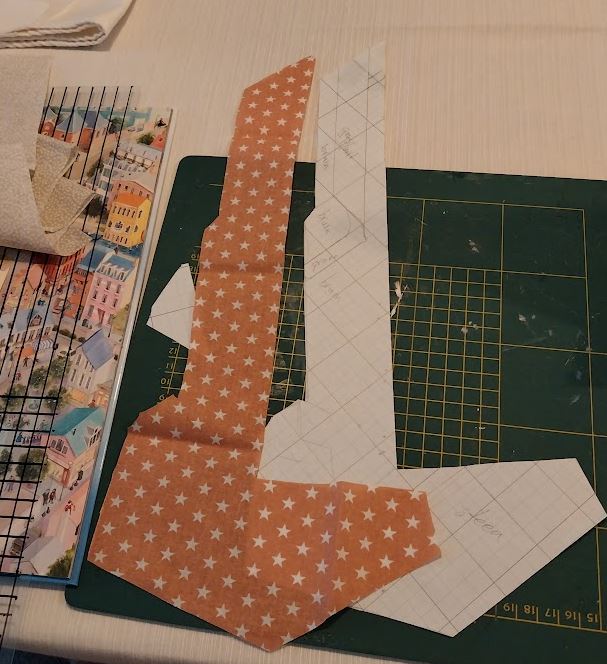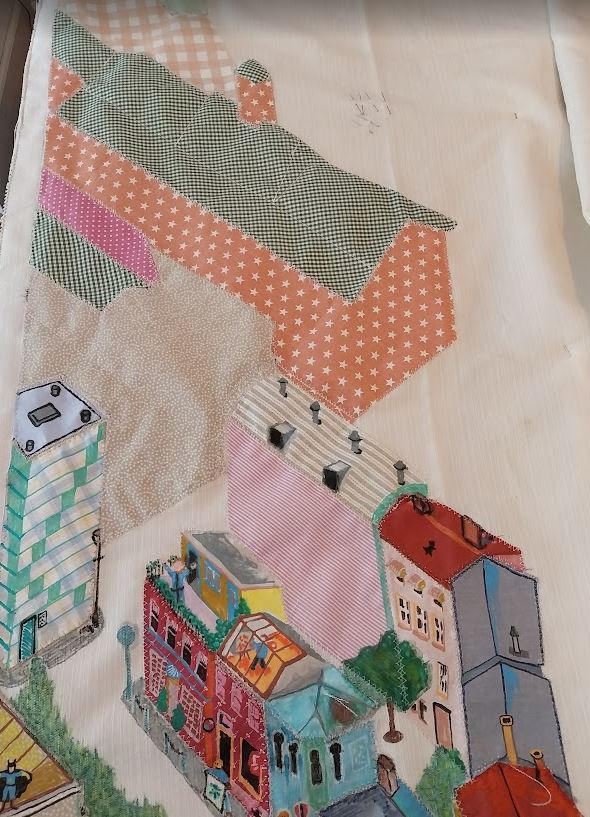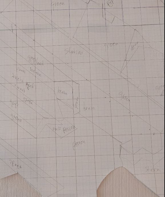 Ik kwam tot de conclusie dat de basisstof gebruiken als stratenplan niet echt een helder beeld geeft. Dus nu moet ik deze open plekken opvullen. Ik heb enkele stukken grijze stof bij elkaar gezocht en hoop daarmee alles te kunnen opvullen. Dat komt de tekeningen ten goede. Op de basisstof vloeit de inkt meer uit.