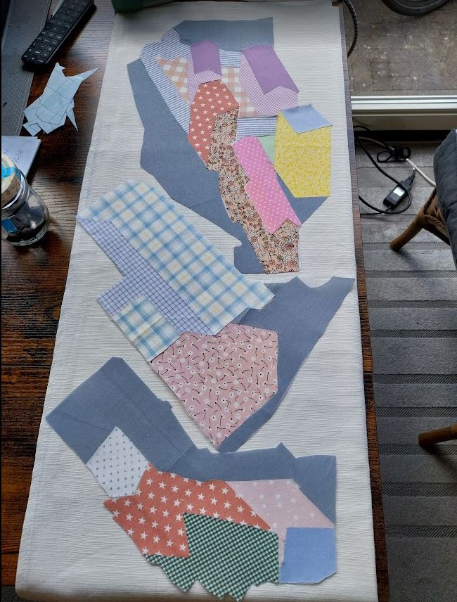 Niet getreurd, dan maar extra strookjes straat. Gelukkig heb ik nog een setje stof met daarin een lapje straat-grijs kunnen halen. Ik wilde heel graag ook een stukje groene stof, maar dat was er niet. Nu heb ik maar een setje groene kussenslopen gehaald. Dus als ik echt groen wil gebruiken, moet ik die maar ‘slopen‘.