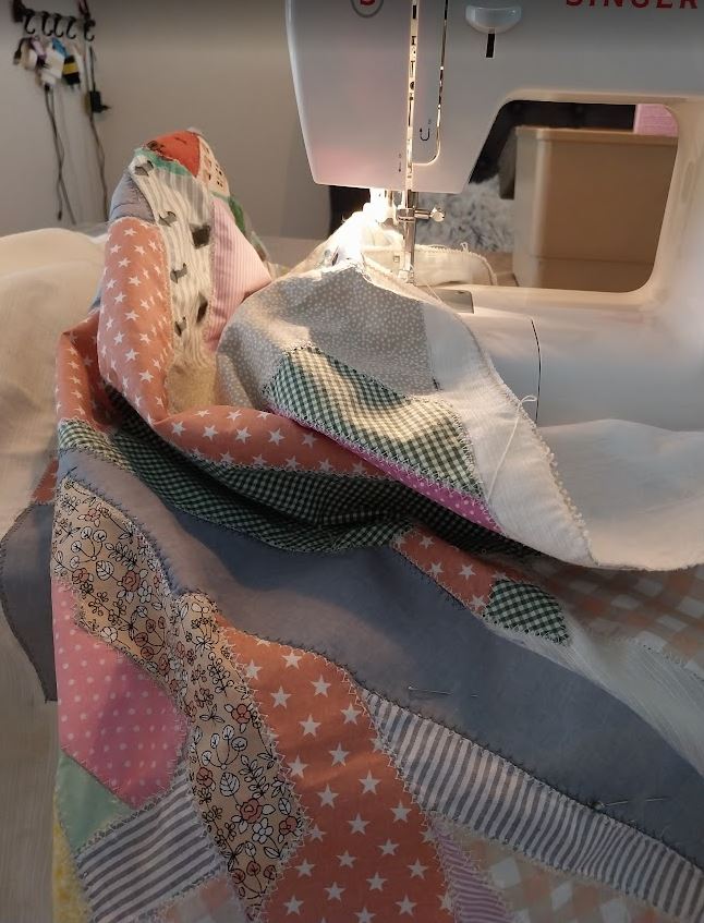 Nog 1 stadsdeel uit stofjes knippen, dan 4 stadsdelen op de vlieseline strijken waarna ik alle patchworklapjes, van iets van 15 stadsdelen, kan vastnaaien. Voor die delen op de basisstof worden genaaid is het wellicht handig om alvast zoveel mogelijk aan detailtekeningen aan te brengen als het nog hanteerbaar is.
