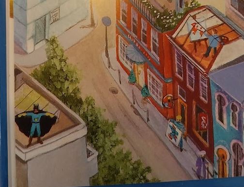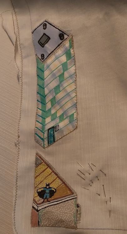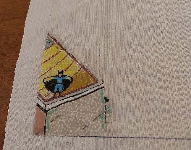 Het eerste blok staat. De stiften doen het goed. Die heb ik voor de zekerheid op een stukje stof uitgeprobeerd. Batman is klaar om de stad voor een ramp te behoeden.